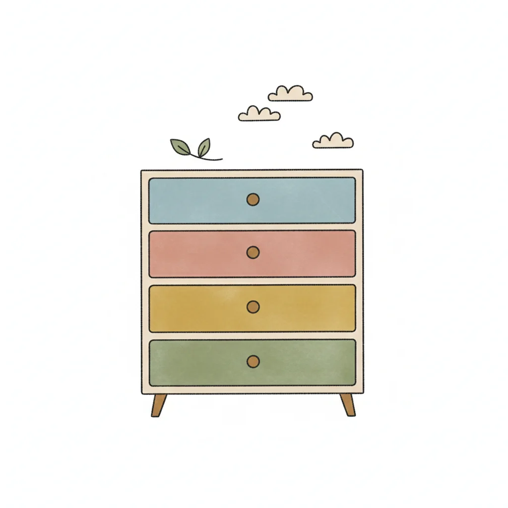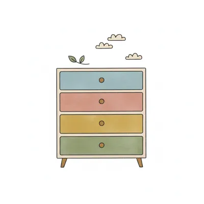 Ein bunter Schrank mit vier Schubladen und zarten Wolken.