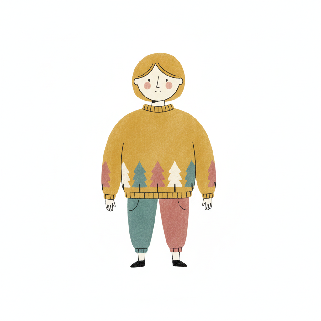 Niedliche Illustration einer Person in einem gelben Pullover mit Baum-Muster und bunter Hose.