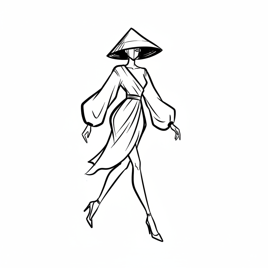 Stilisierte Frau mit Reishut, Wickelkleid und High Heels, in Schwarz-Weiß gezeichnet.