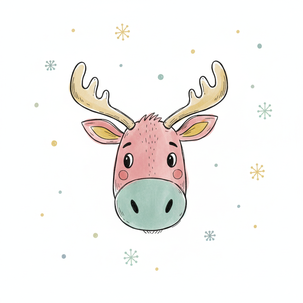 Niedliches rosa Elch-Cartoon mit hellblauer Schnauze und gelben Geweihen auf weißem Hintergrund.