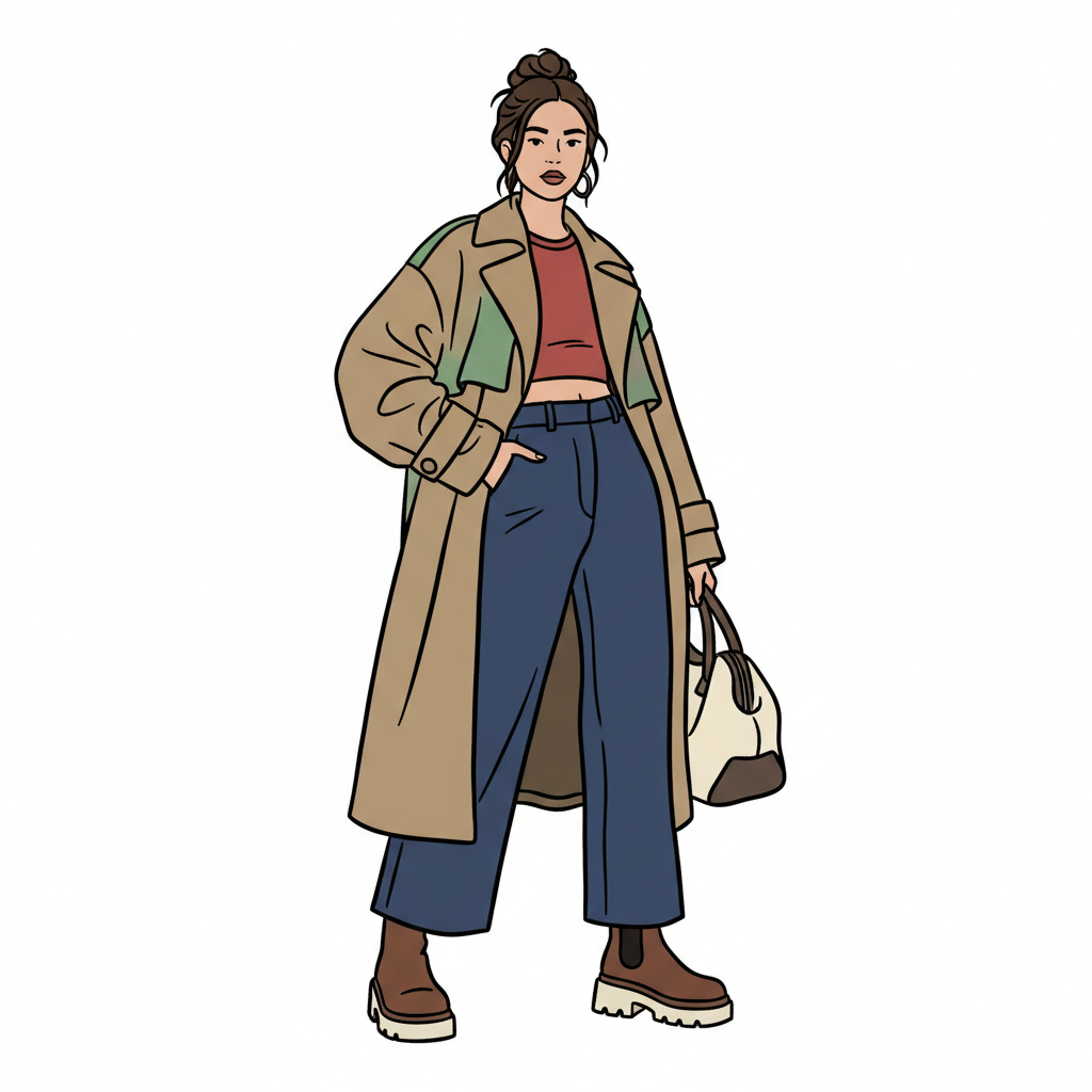 Stilvolle Cartoon-Frau in Trenchcoat, Crop Top, blauen Hosen und klobigen Stiefeln mit Tasche.