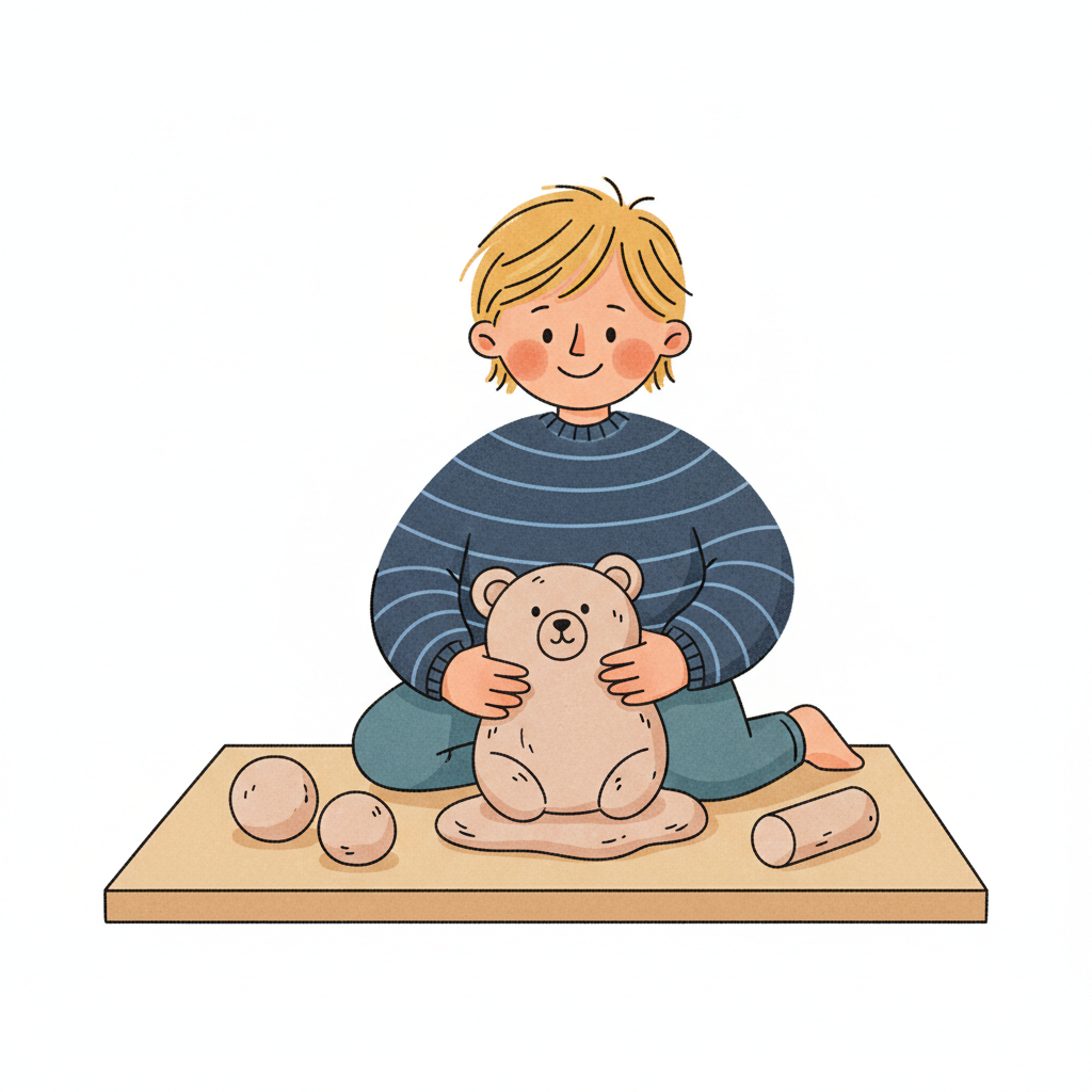 Ein lächelndes Kind modelliert einen Bären aus Ton auf einem Holzbrett.