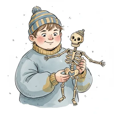 Junge mit Mütze hält ein kleines Skelettmodell, das ebenfalls eine Mütze trägt.