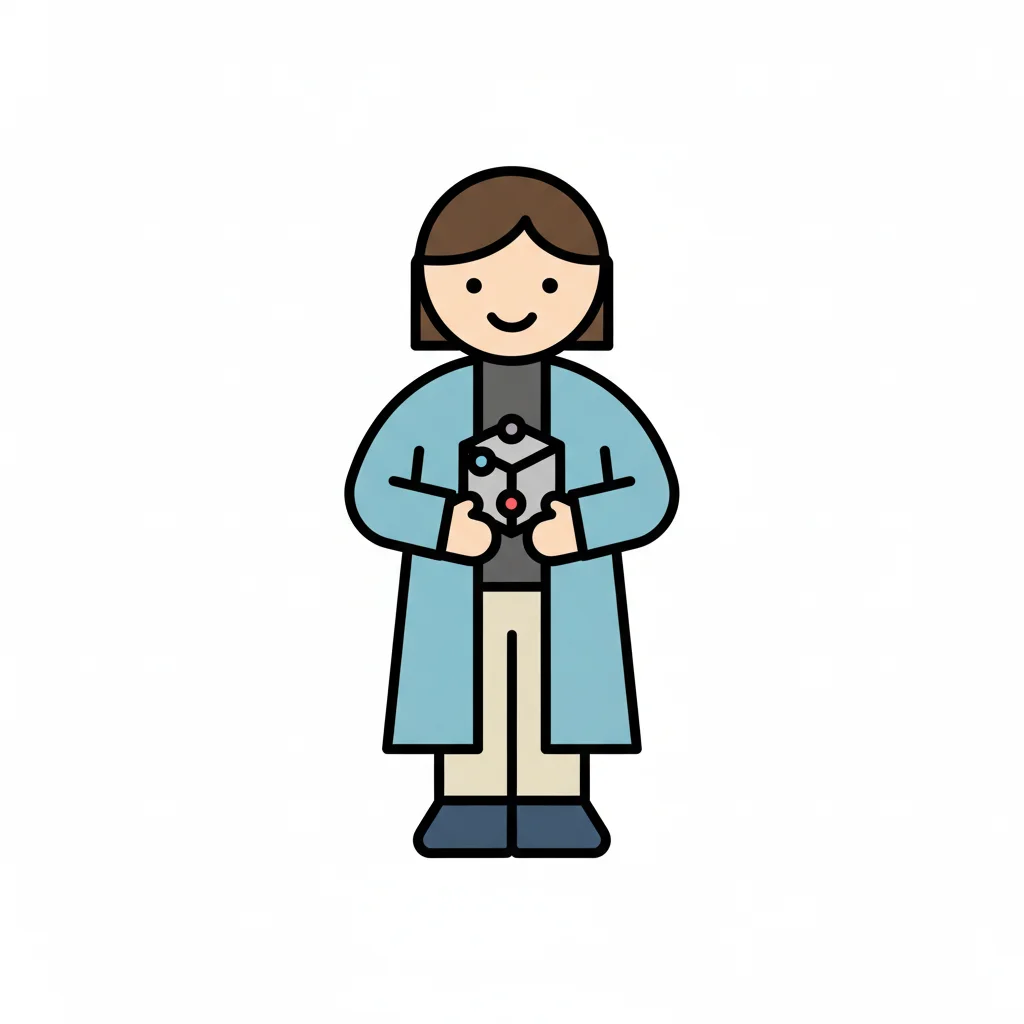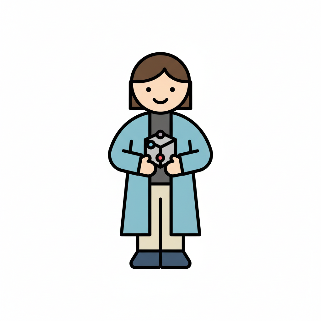 Stilisierte Figur in Laborkittel hält einen Würfel mit Molekülmodell.