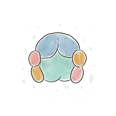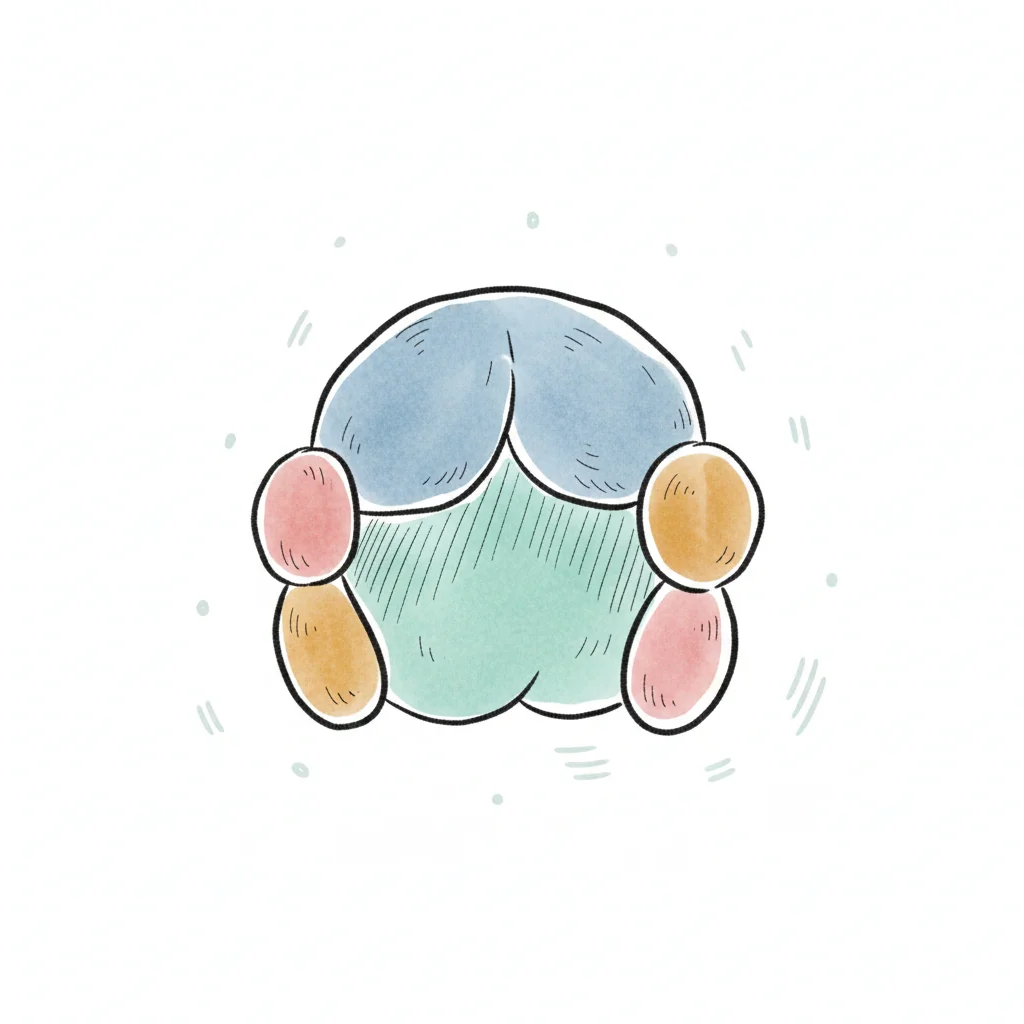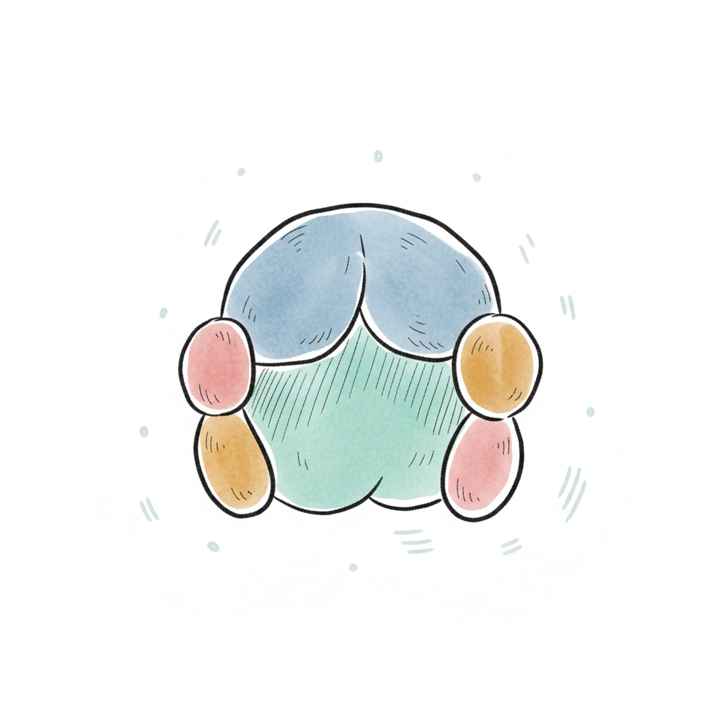 Eine bunte, cartoonartige Darstellung eines Moleküls oder Proteinkomplexes mit blauer, grüner und ockerfarbener Färbung.