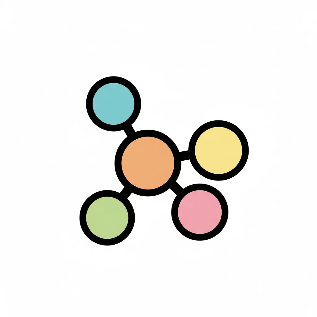 Bunte Molekül- oder Netzwerkdarstellung mit fünf verbundenen Kreisen auf weißem Hintergrund.