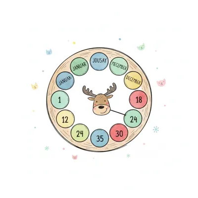 Niedliches Rentier-Kalenderbrett mit Monaten und Zahlen, umgeben von kleinen Katzen und Schneeflocken.