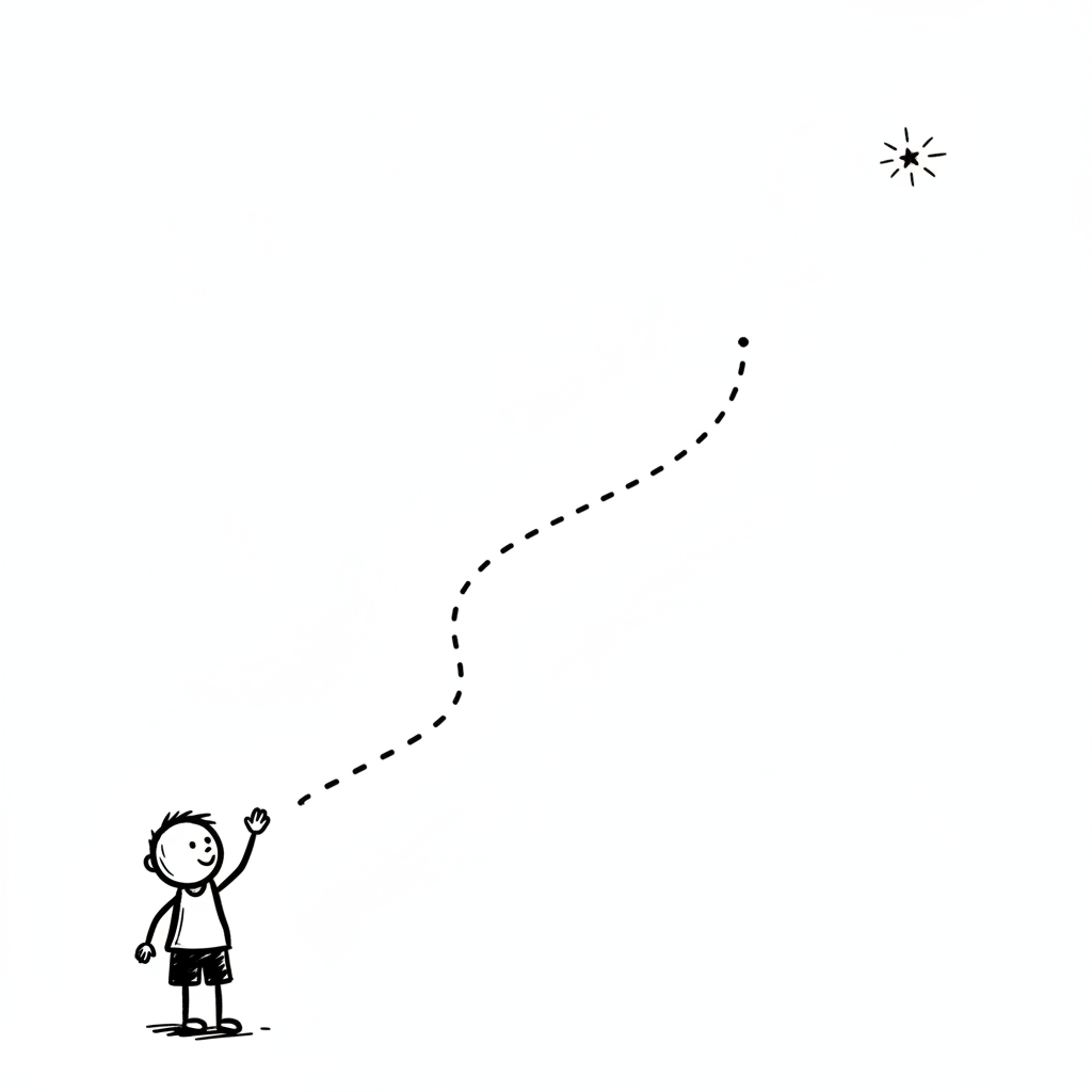 Strichmännchen streckt Hand nach Stern aus, symbolisiert Ziele und Träume.