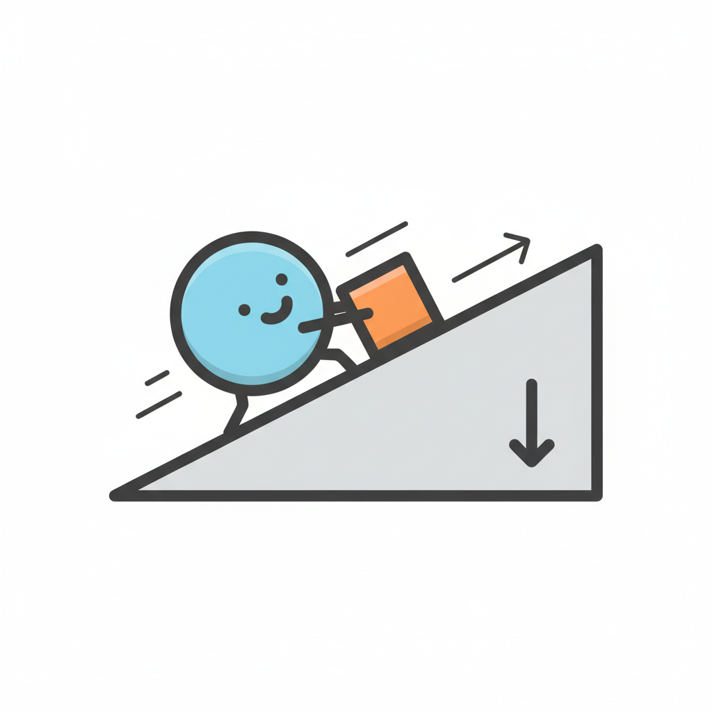 Ein fröhlicher blauer Cartoon-Charakter schiebt einen orangefarbenen Würfel einen Hang hinauf.