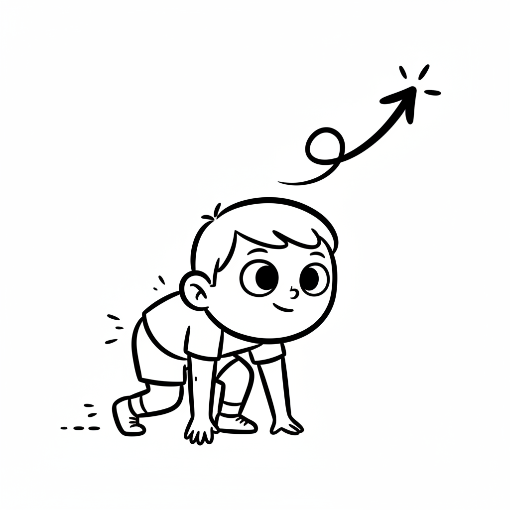 Ein Cartoon-Junge in Startposition blickt auf einen aufsteigenden Pfeil, der Fortschritt symbolisiert.