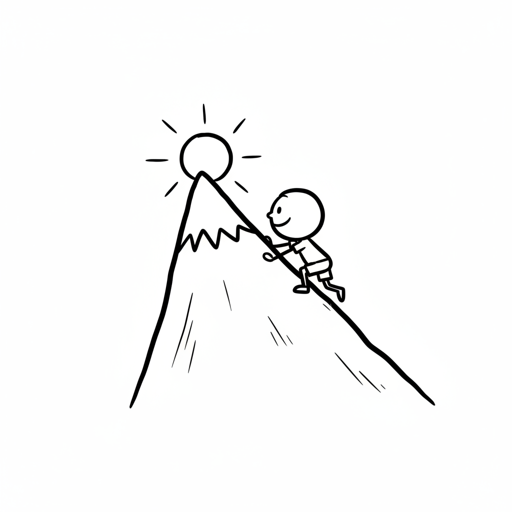 Ein lächelndes Strichmännchen erklimmt einen Berg, die Sonne scheint am Gipfel.