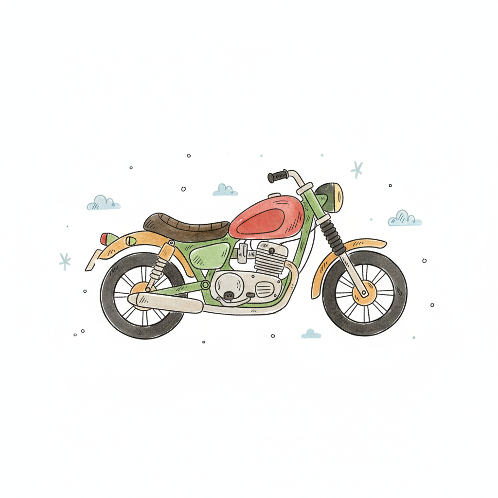 Bunte Zeichnung eines Motorrads mit Wolken im Hintergrund.