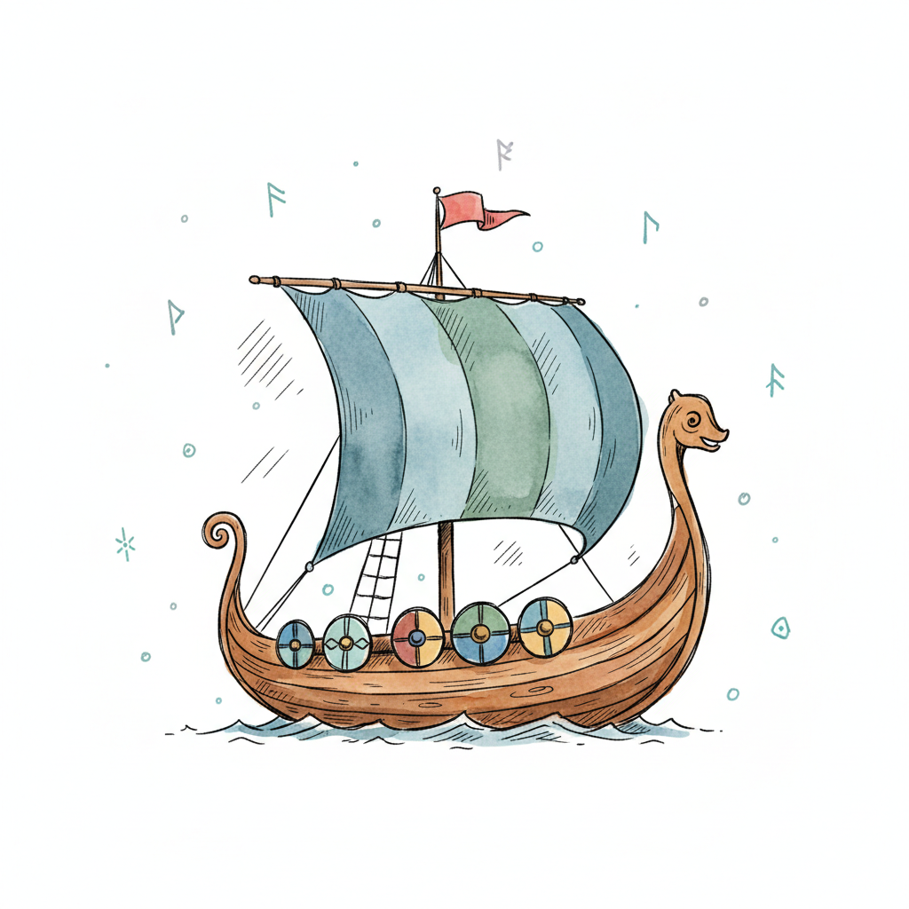 Aquarell-Illustration eines Wikingerschiffs mit Segel, Schilden und Drachenkopf auf dem Wasser.