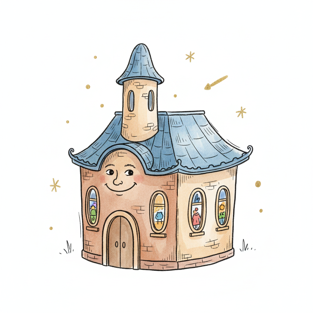 Ein fröhliches, cartoonartiges Haus mit Gesicht, blauer Dach und Sternen. Aquarell-Illustration.