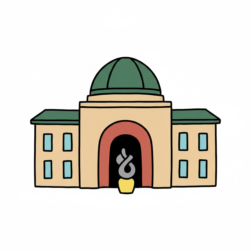 Handgezeichnetes Gebäude mit grüner Kuppel, beigem Hauptteil und einem stilisierten Objekt im Eingang.
