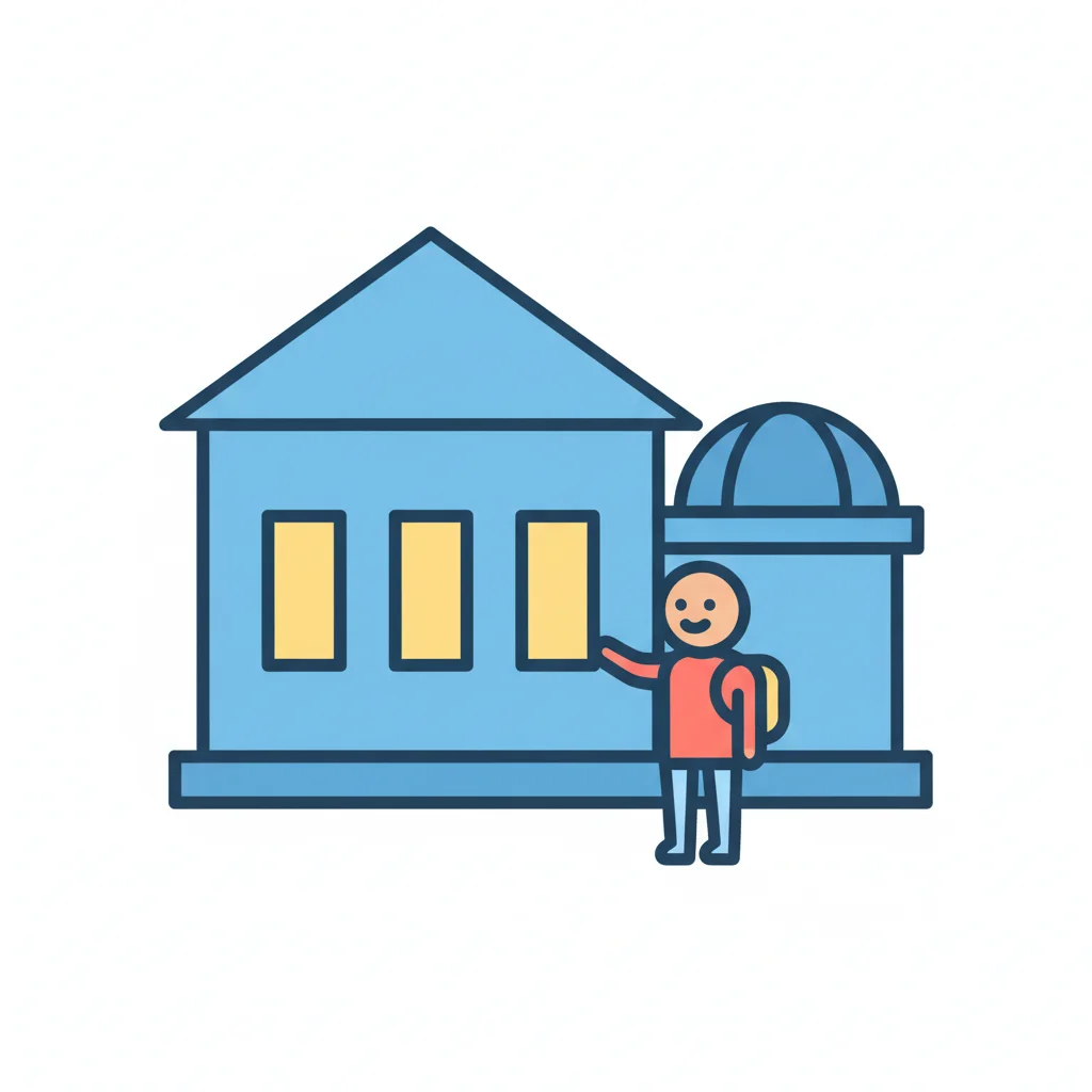 Illustration: Kind mit Rucksack winkt vor blauem Gebäude mit Kuppel.