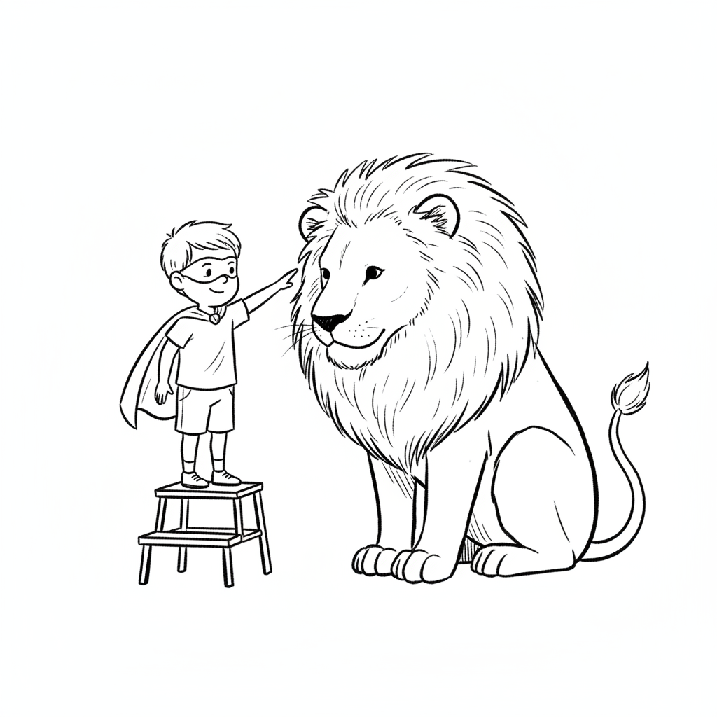 Superhelden-Kind auf Hocker streichelt sitzenden Löwen. Schwarz-Weiß-Illustration.