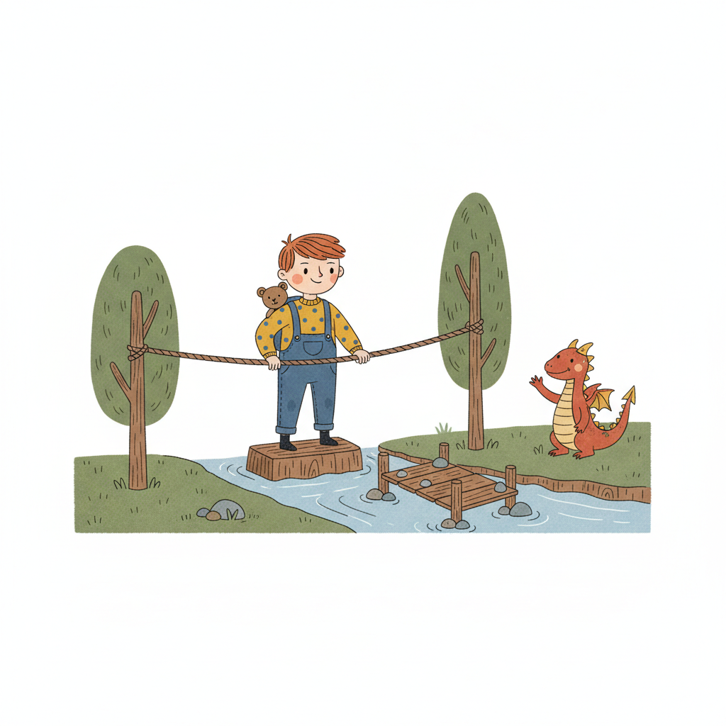 Illustration: Junge mit Teddy balanciert über Fluss, ein Drache winkt ihm zu.
