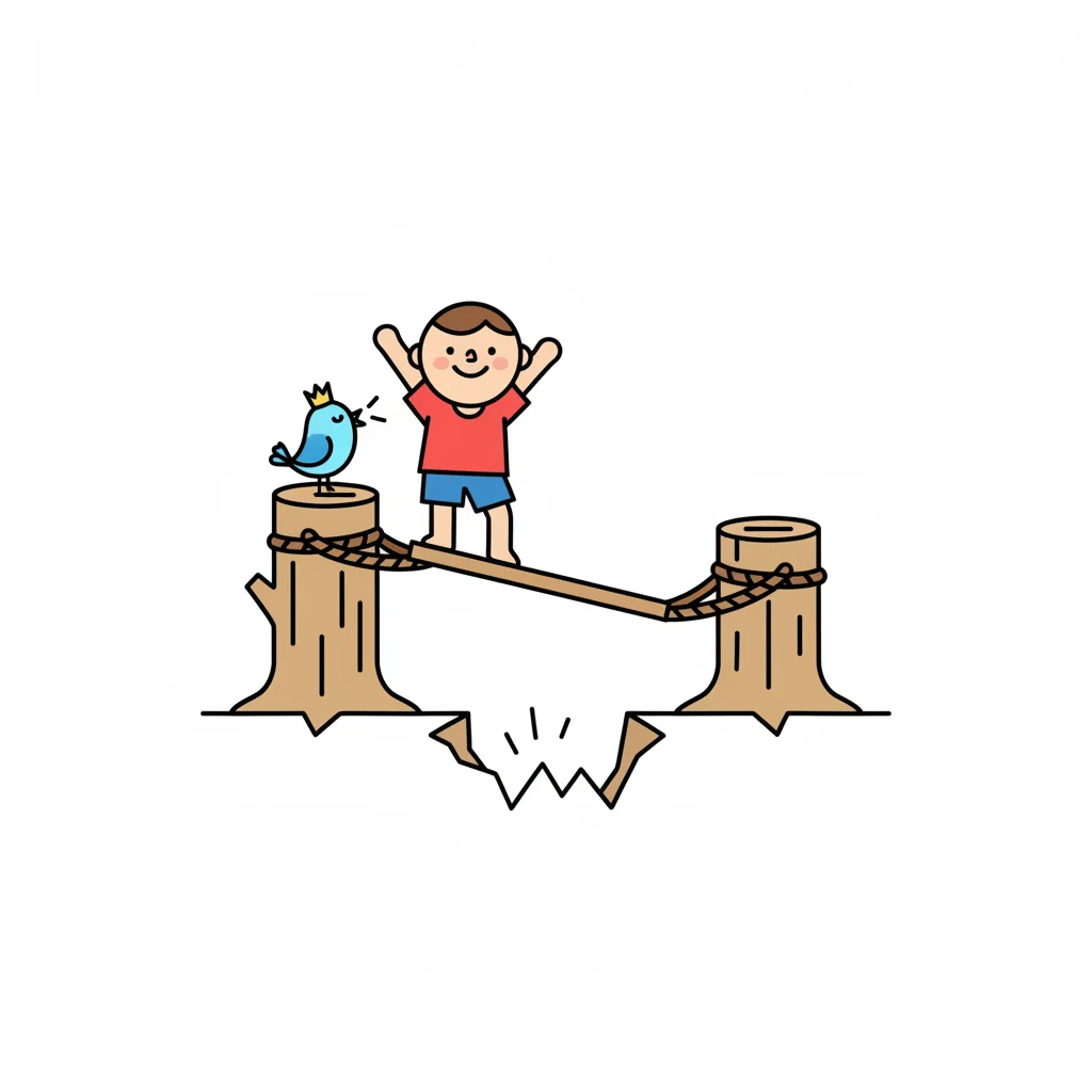 Glücklicher Junge balanciert auf einer Holzbrücke über einer Schlucht, beobachtet von einem Vogel.