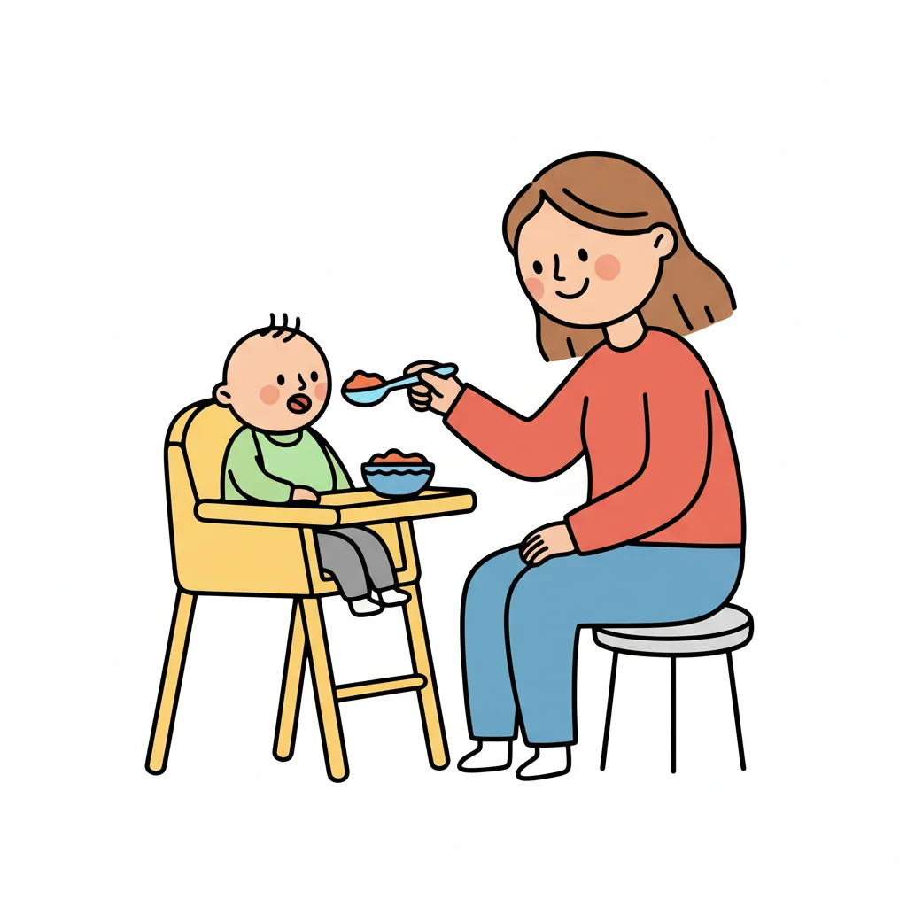 Eine Frau füttert ein Baby im Hochstuhl mit Brei. Eine liebevolle Szene der Kinderernährung.