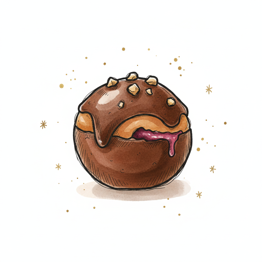Illustration eines Schoko-Donuts mit Nüssen und herauslaufender Beerenfüllung auf weißem Grund.