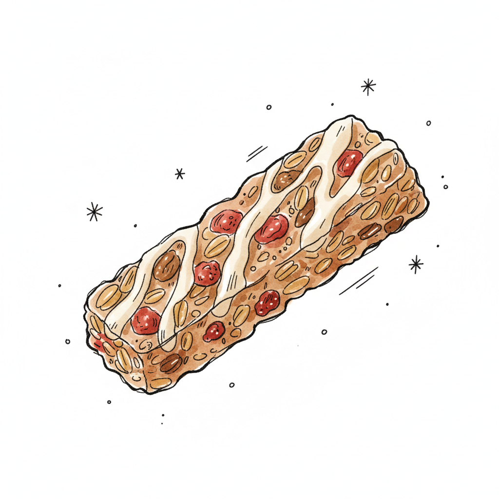 Gezeichneter Nougatriegel mit Mandeln, Haselnüssen und dunklen Stücken auf weißem Hintergrund.