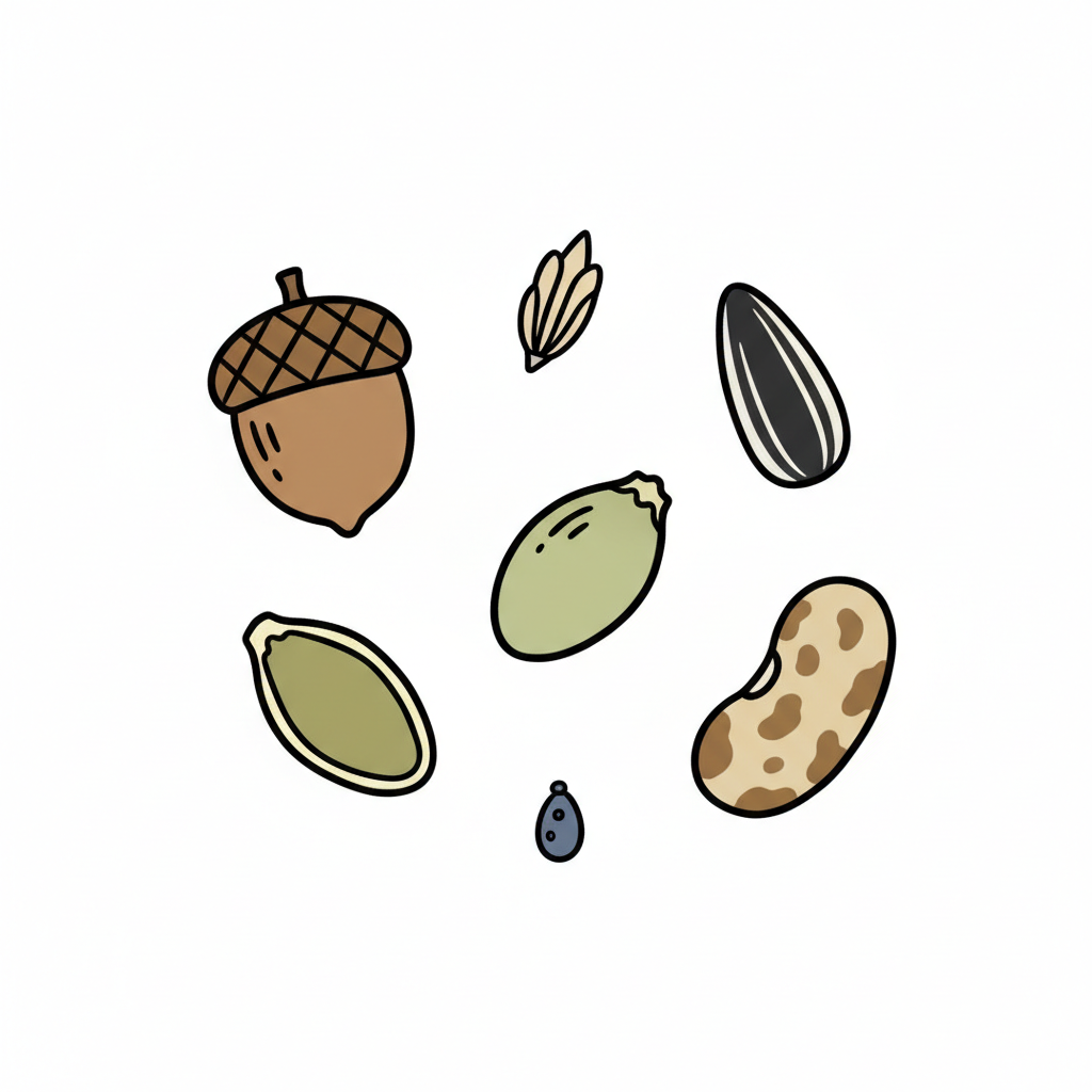 Eine bunte Ansammlung von cartoonartigen Nüssen und Samen, darunter Eichel, Sonnenblumen- und Kürbiskerne.