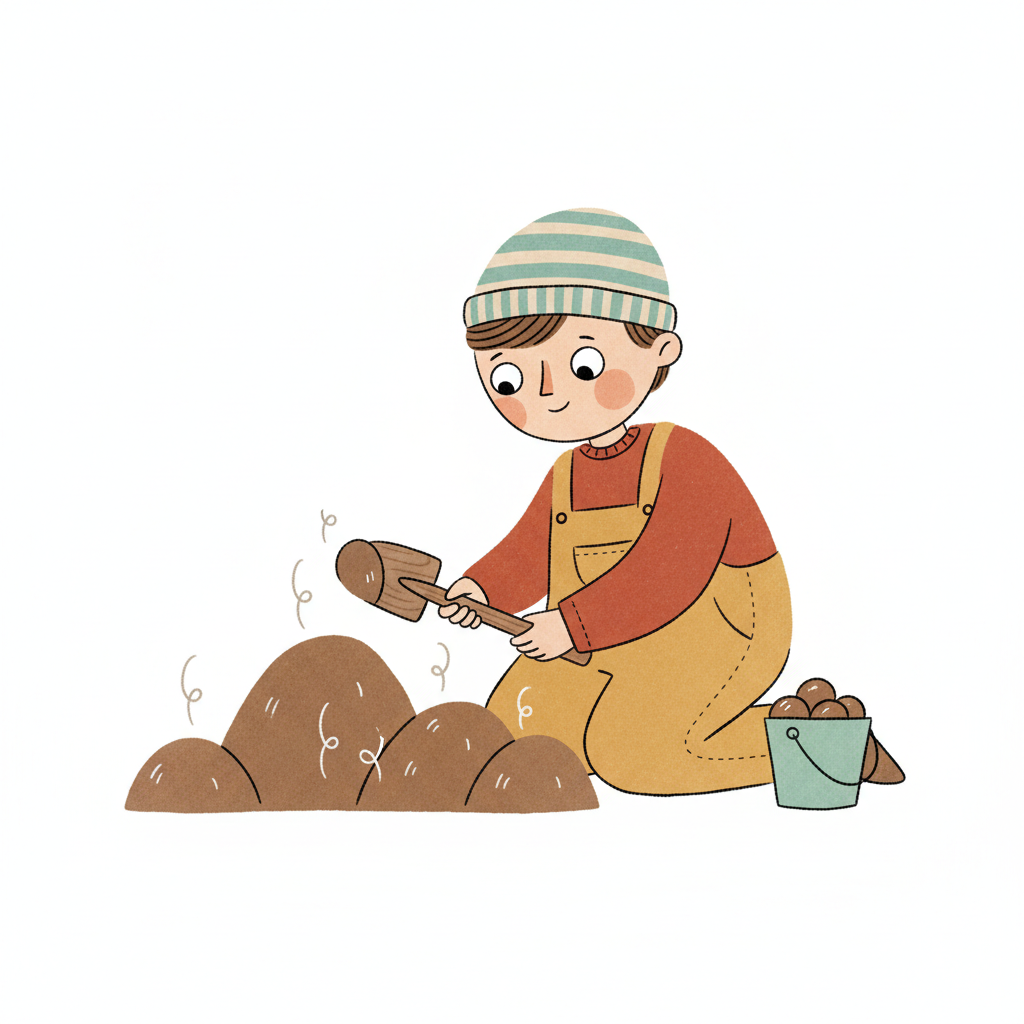Ein Junge mit Mütze kniet und schlägt mit einem Holzhammer auf braune Hügel, daneben ein Eimer voller Nüsse.