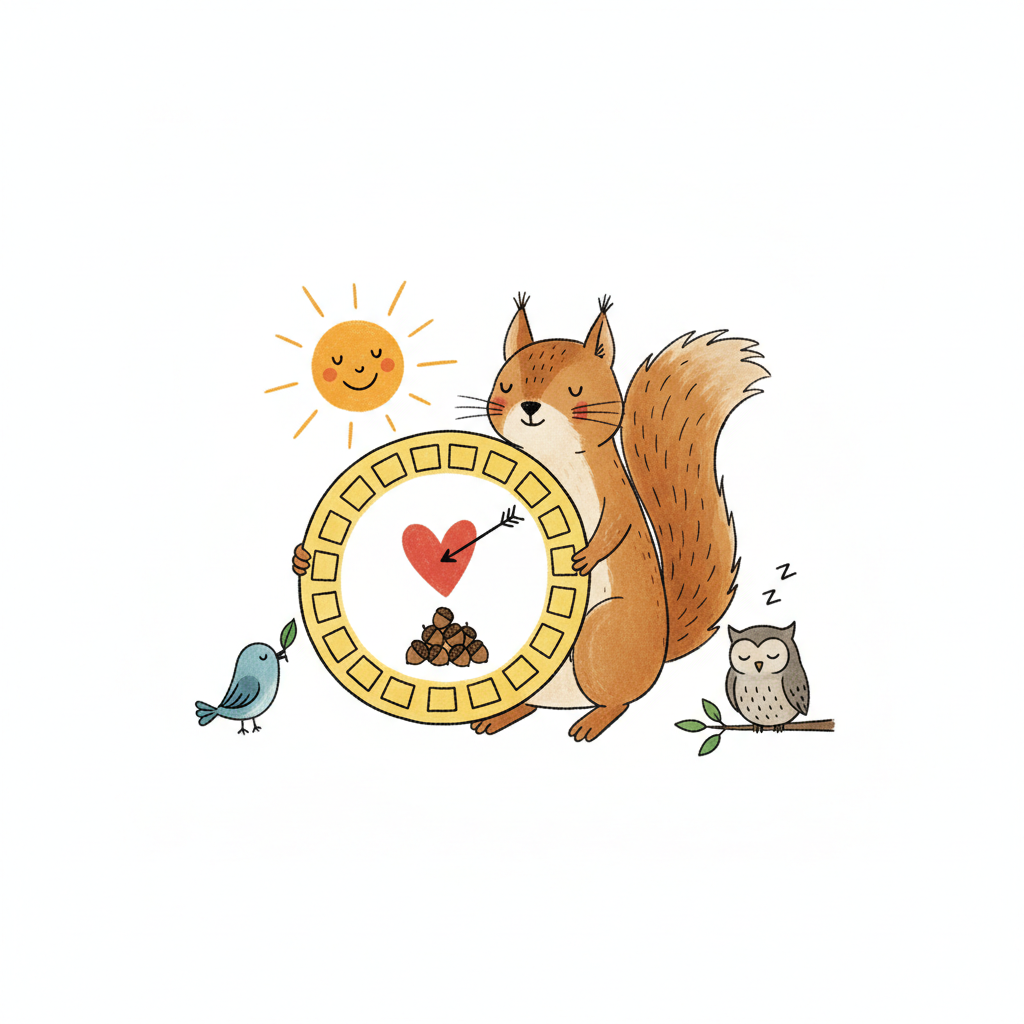 Niedliches Eichhörnchen mit Waffel, Herz und Nüssen, umgeben von Sonne, Vogel und schlafender Eule.
