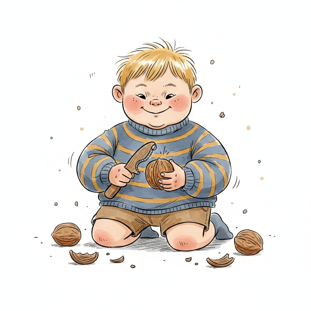 Ein lächelndes Kind knackt Nüsse mit einem Werkzeug, umgeben von Nussschalen.