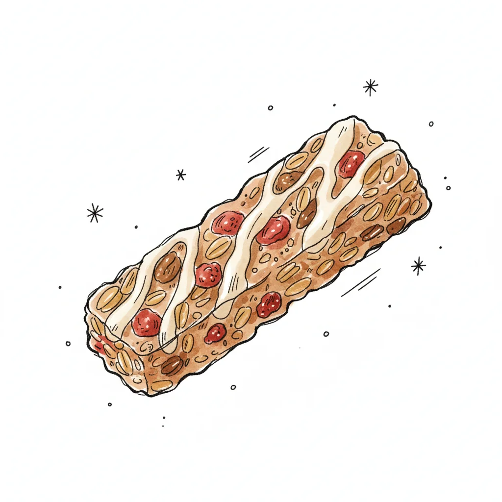Handgezeichneter Müsliriegel mit Nüssen, Trockenfrüchten und weißem Zuckerguss auf weißem Grund.