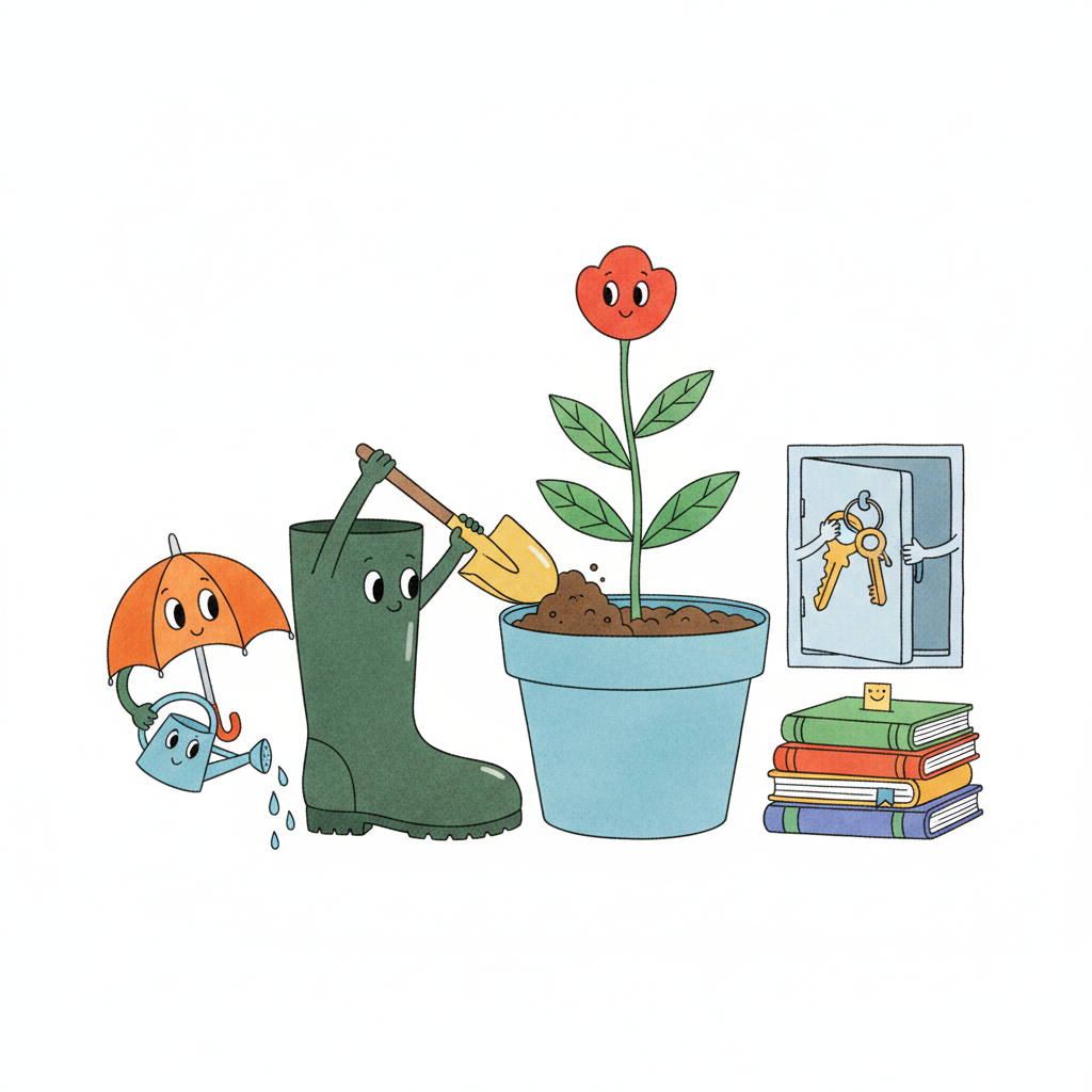 Niedliche Cartoon-Illustration von Wachstum: Gummistiefel pflanzt Blume, Regenschirm gießt, daneben Bücher und Schlüssel.