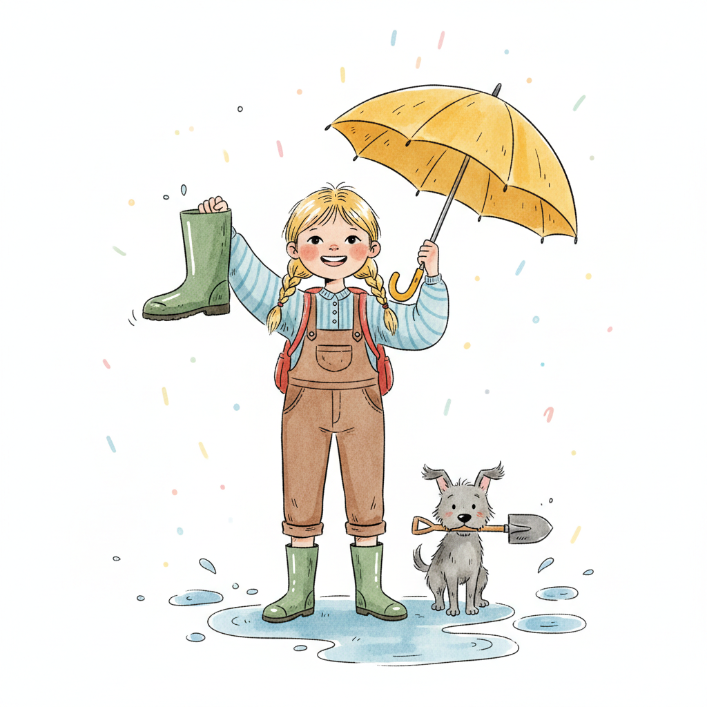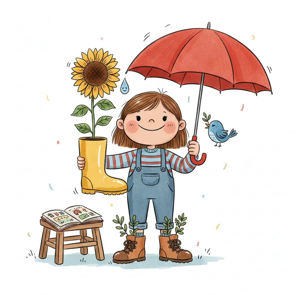 Fröhliches Mädchen mit Regenschirm und Sonnenblume in einem Stiefel, umgeben von Natur und Pflanzen.