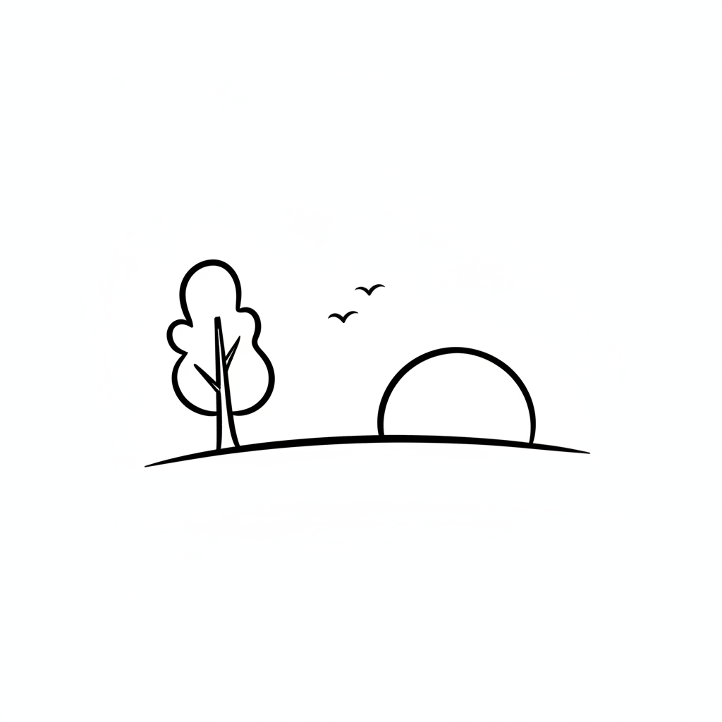 Minimalistische Strichzeichnung einer Landschaft mit Baum, Sonne/Mond und Vögeln.