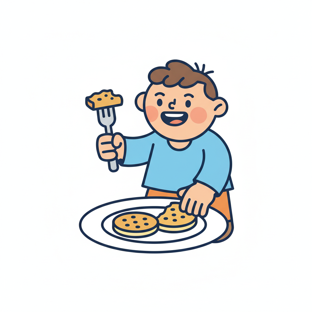 Glücklicher Cartoon-Junge isst mit Gabel von einem Teller mit Pfannkuchen.
