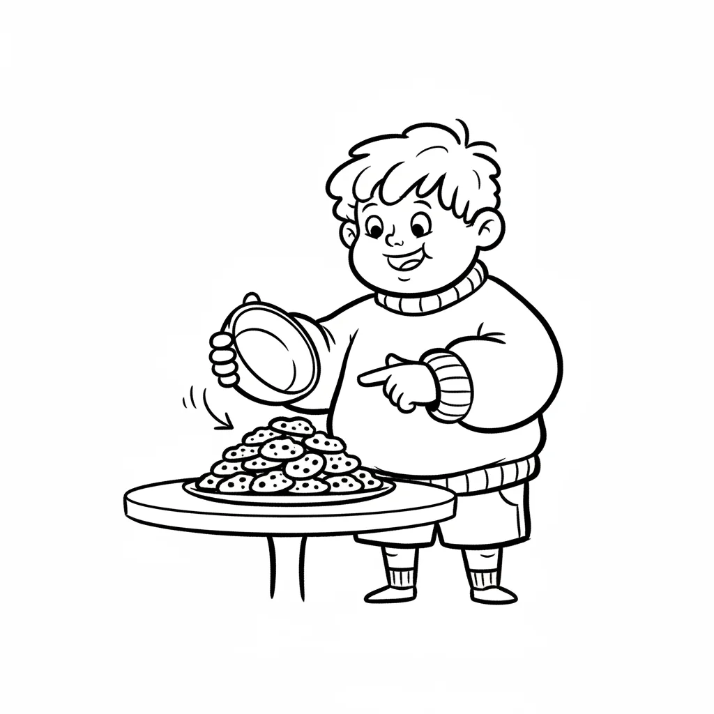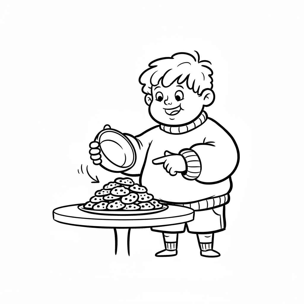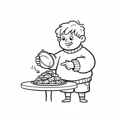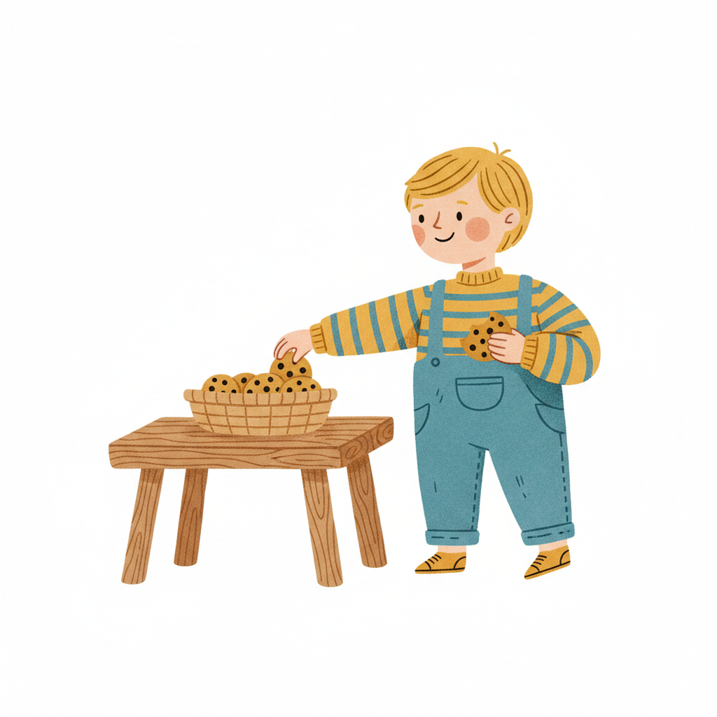 Ein lächelnder Cartoon-Junge nimmt Kekse aus einem Korb auf einem Holztisch.