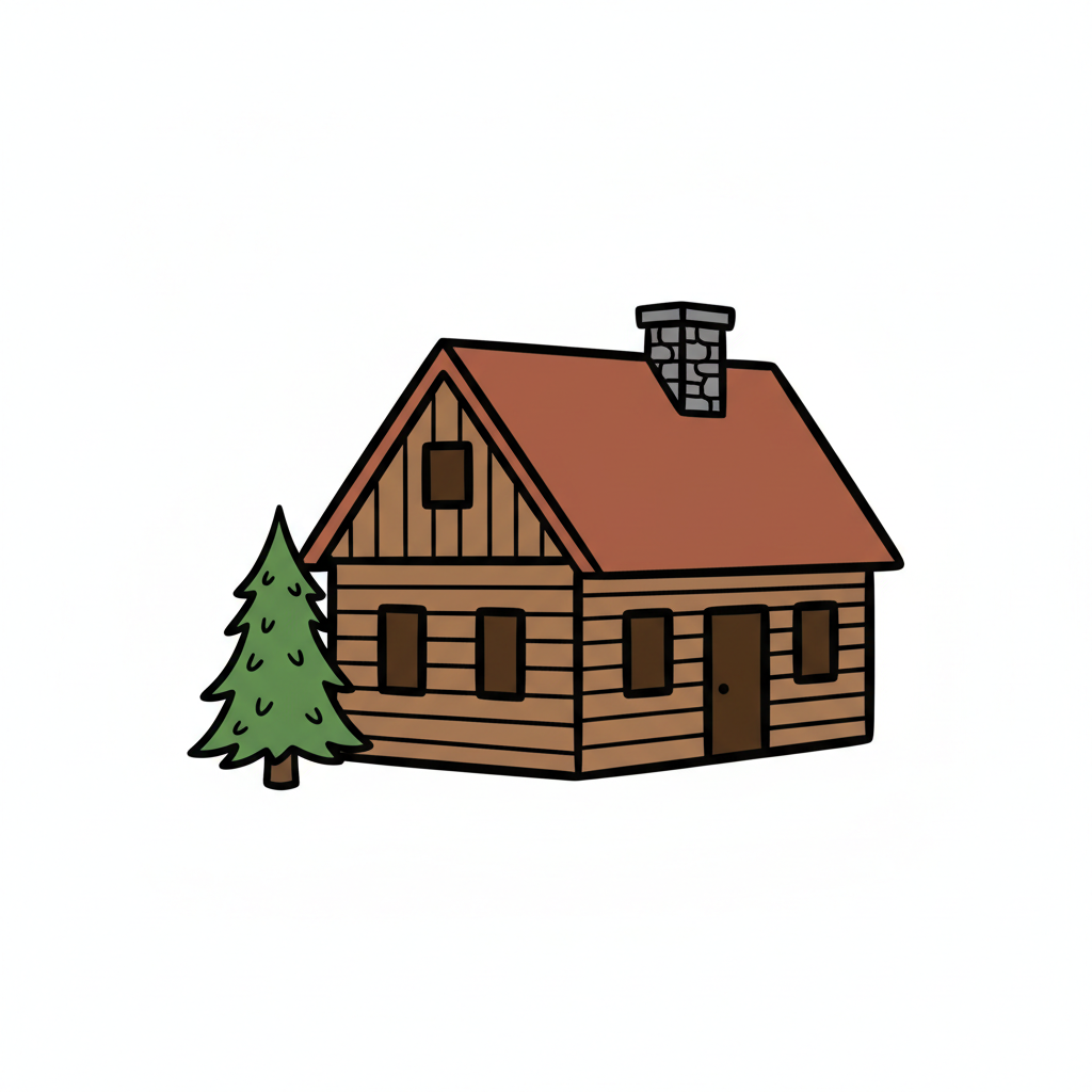 Cartoon-Stil Blockhütte mit braunem Dach und Schornstein, daneben ein Nadelbaum auf weißem Grund.