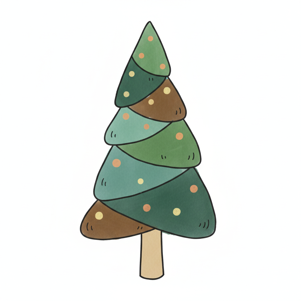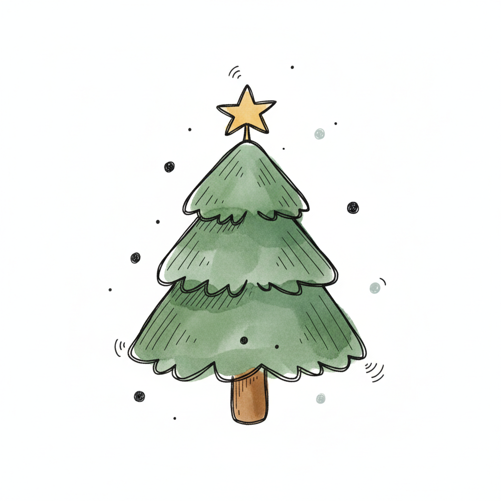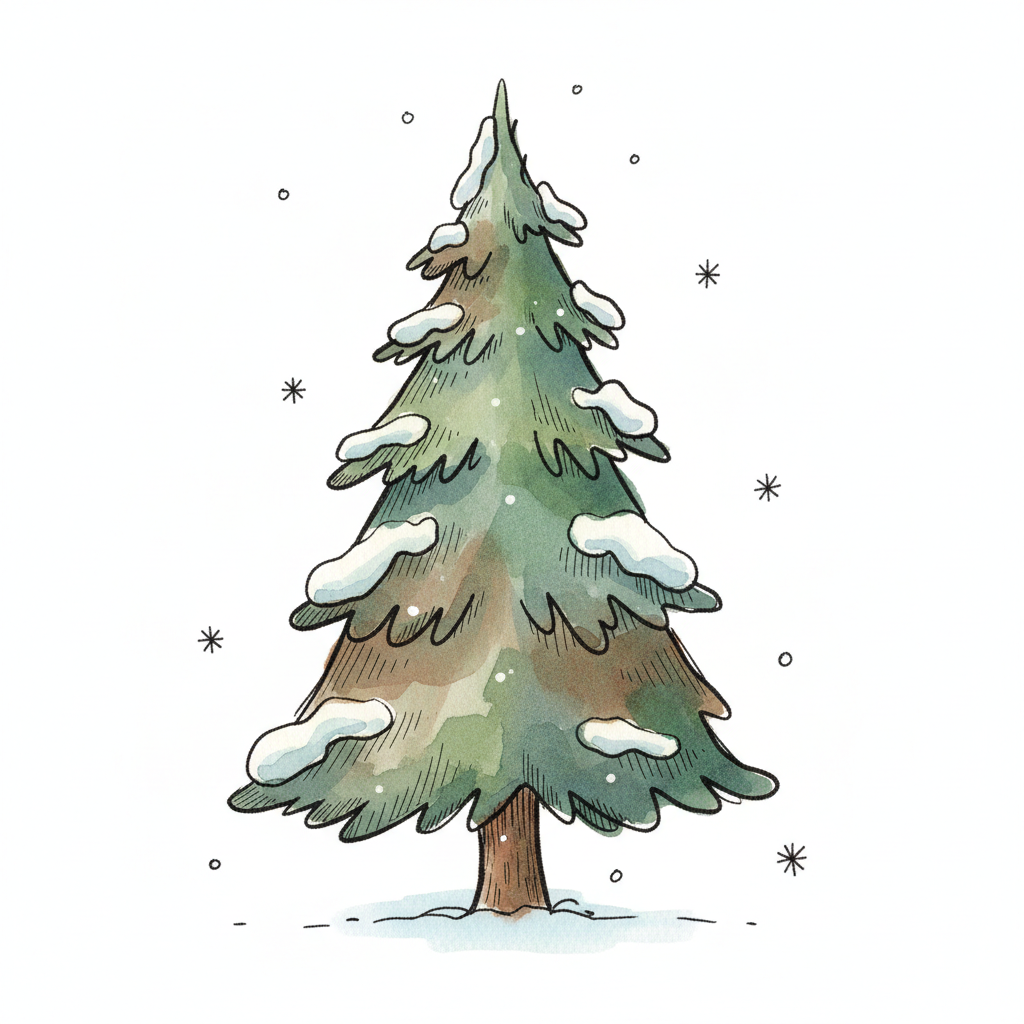 Gezeichneter grüner Tannenbaum mit braunem Stamm und Schnee am Fuß auf weißem Hintergrund.