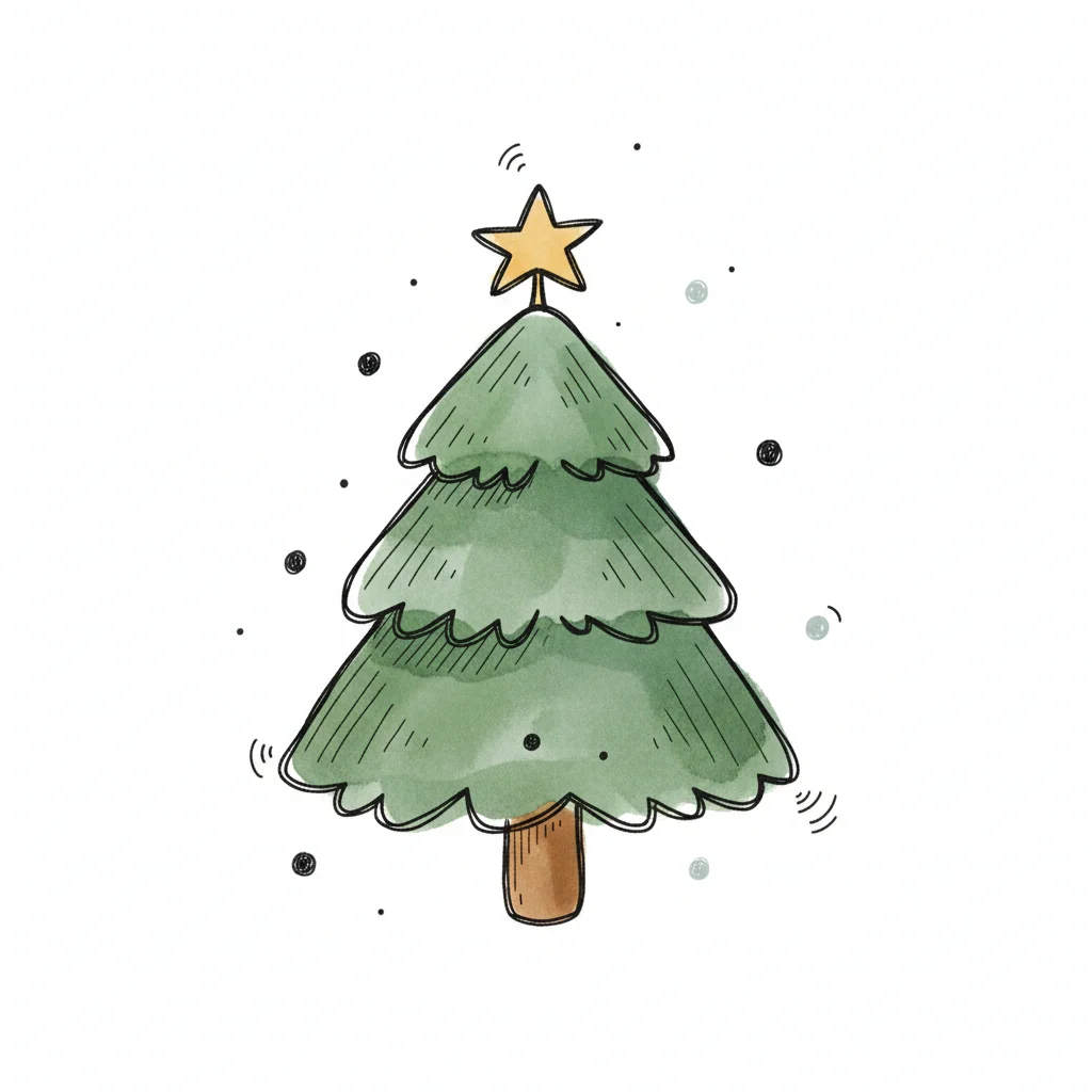Niedlicher, gezeichneter Weihnachtsbaum mit gelbem Stern auf der Spitze, im Aquarellstil.