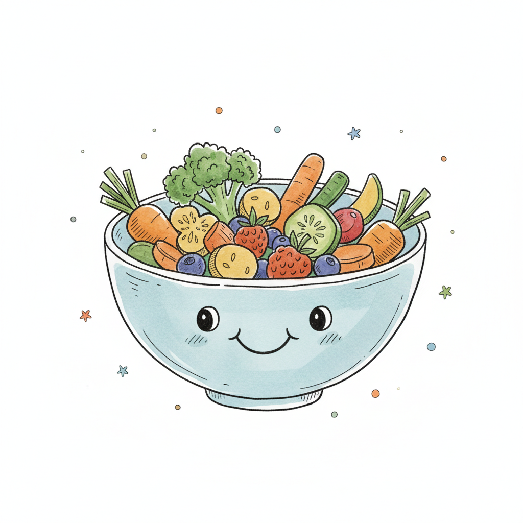 Niedliche Cartoon-Schüssel voller bunter Früchte und Gemüse mit einem lächelnden Gesicht.
