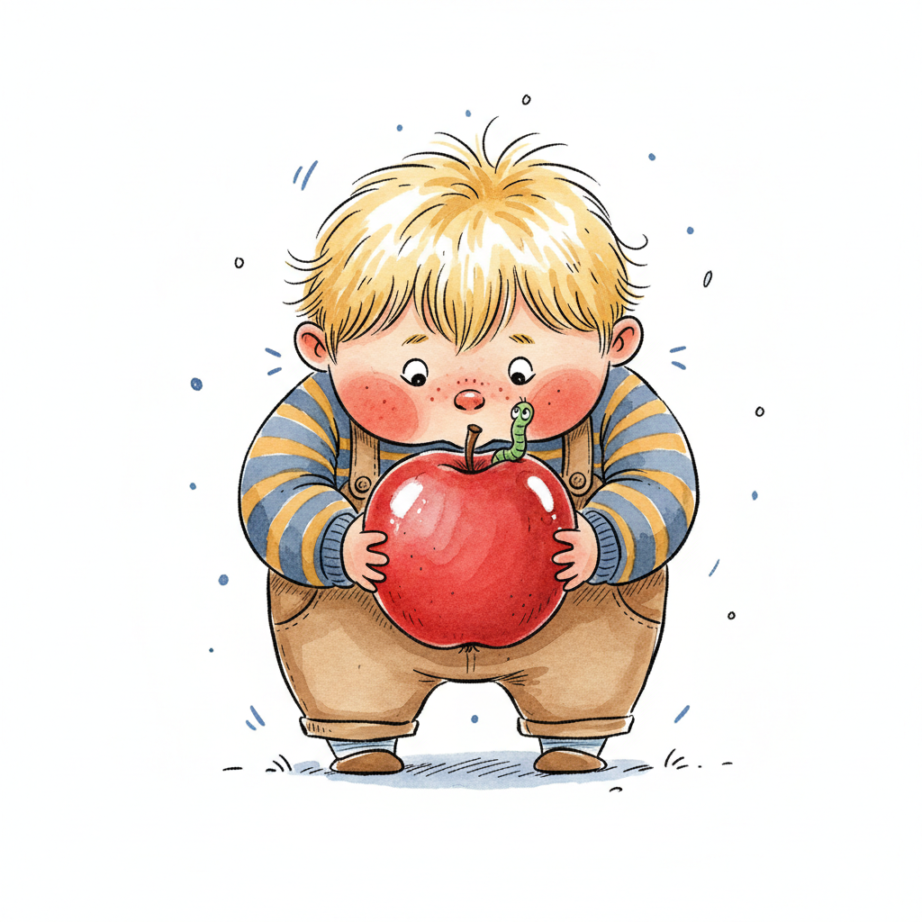 Ein fröhlicher Cartoon-Junge mit gestreiftem Pullover hält einen riesigen roten Apfel.