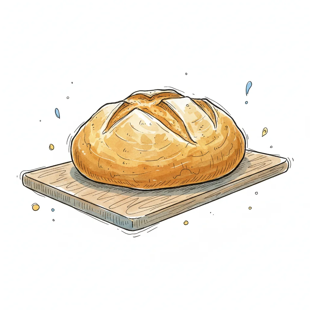 Handgezeichneter, goldbrauner Brotlaib mit Kreuzschnitt auf einem Holzbrett.