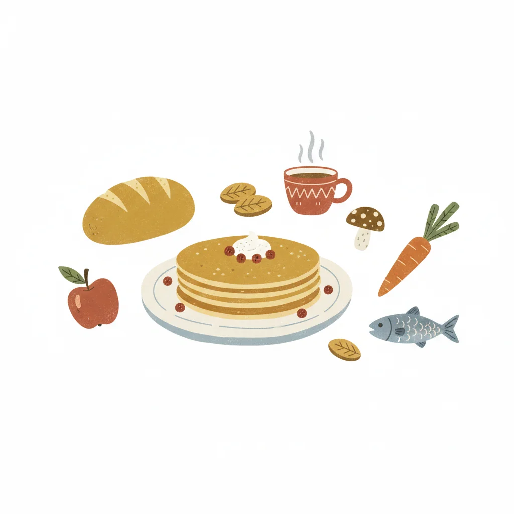 Bunte Illustration von Lebensmitteln: Pfannkuchen, Brot, Apfel, Fisch, Karotte, Pilz, Heißgetränk.
