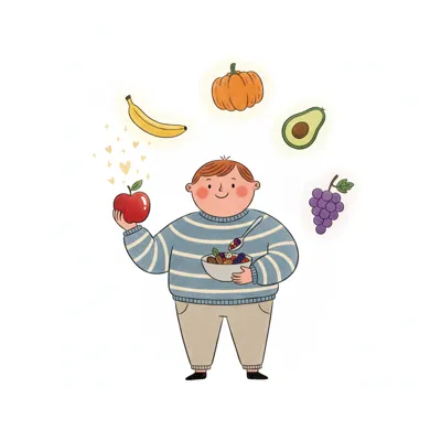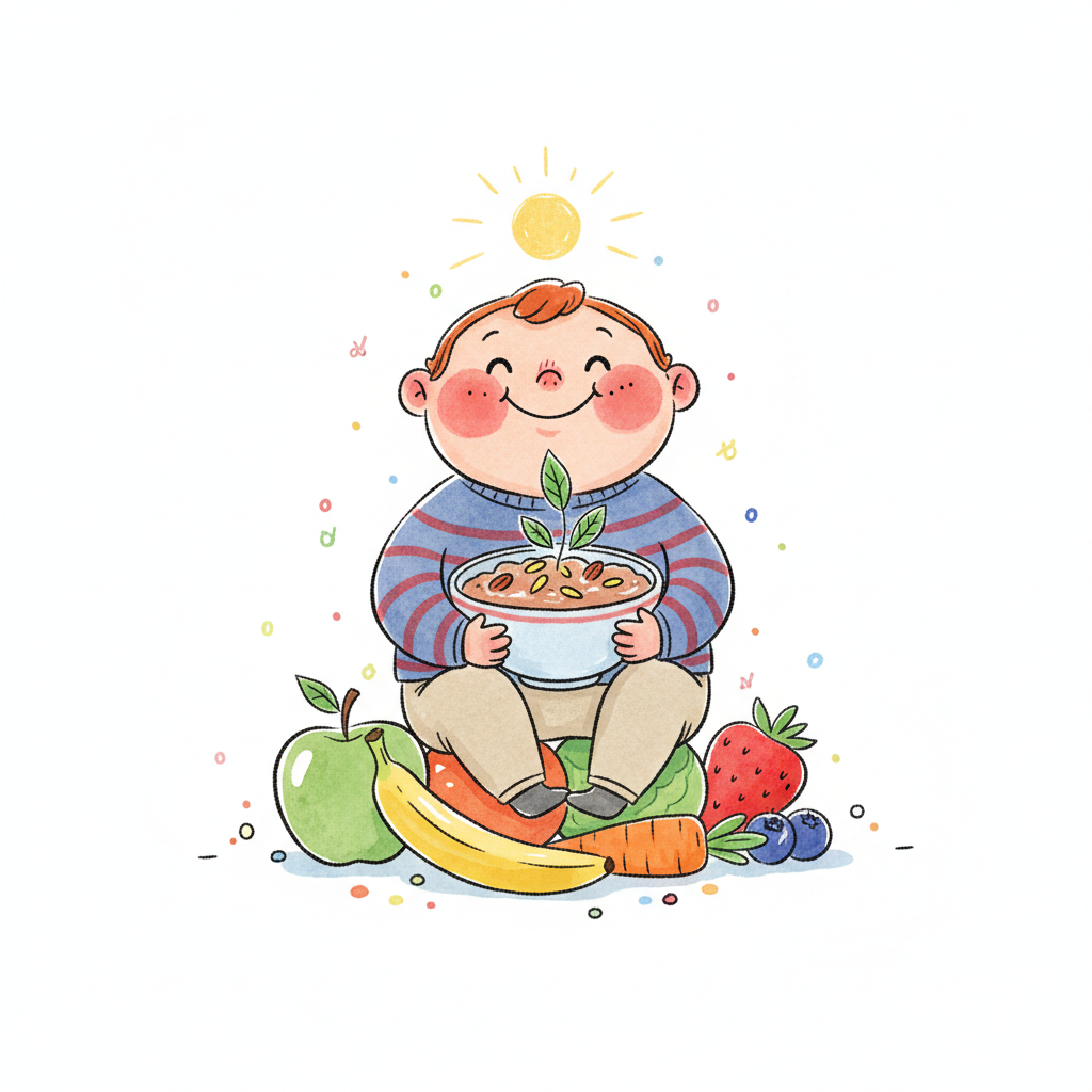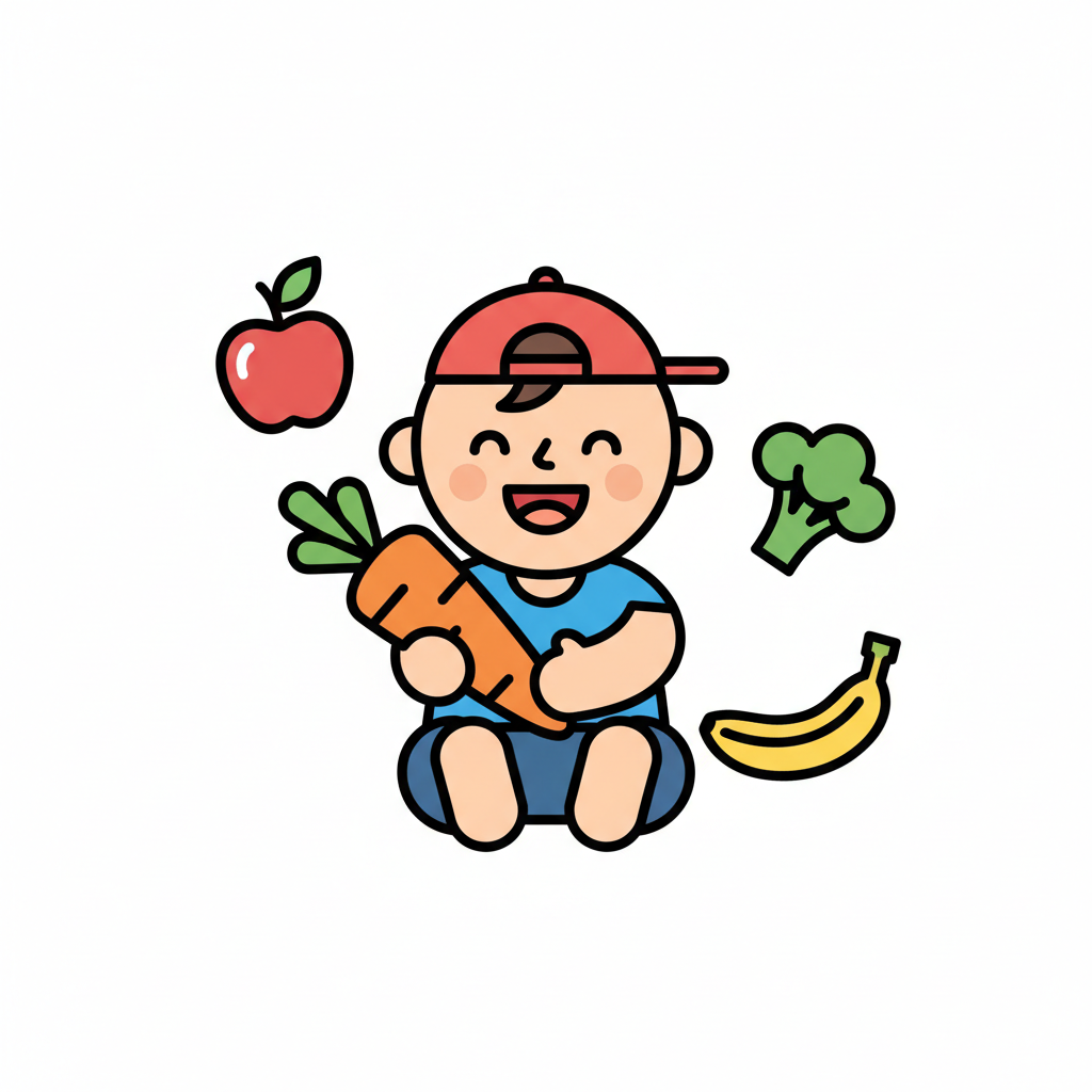 Fröhliches Cartoon-Kind mit Karotte, umgeben von Obst und Gemüse (Apfel, Brokkoli, Banane).