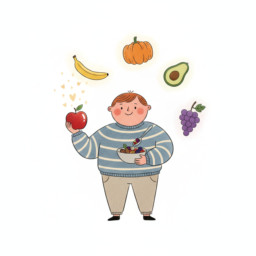Fröhliche Cartoonfigur mit Obstschale, umgeben von Früchten wie Apfel, Banane, Kürbis, Avocado, Trauben.