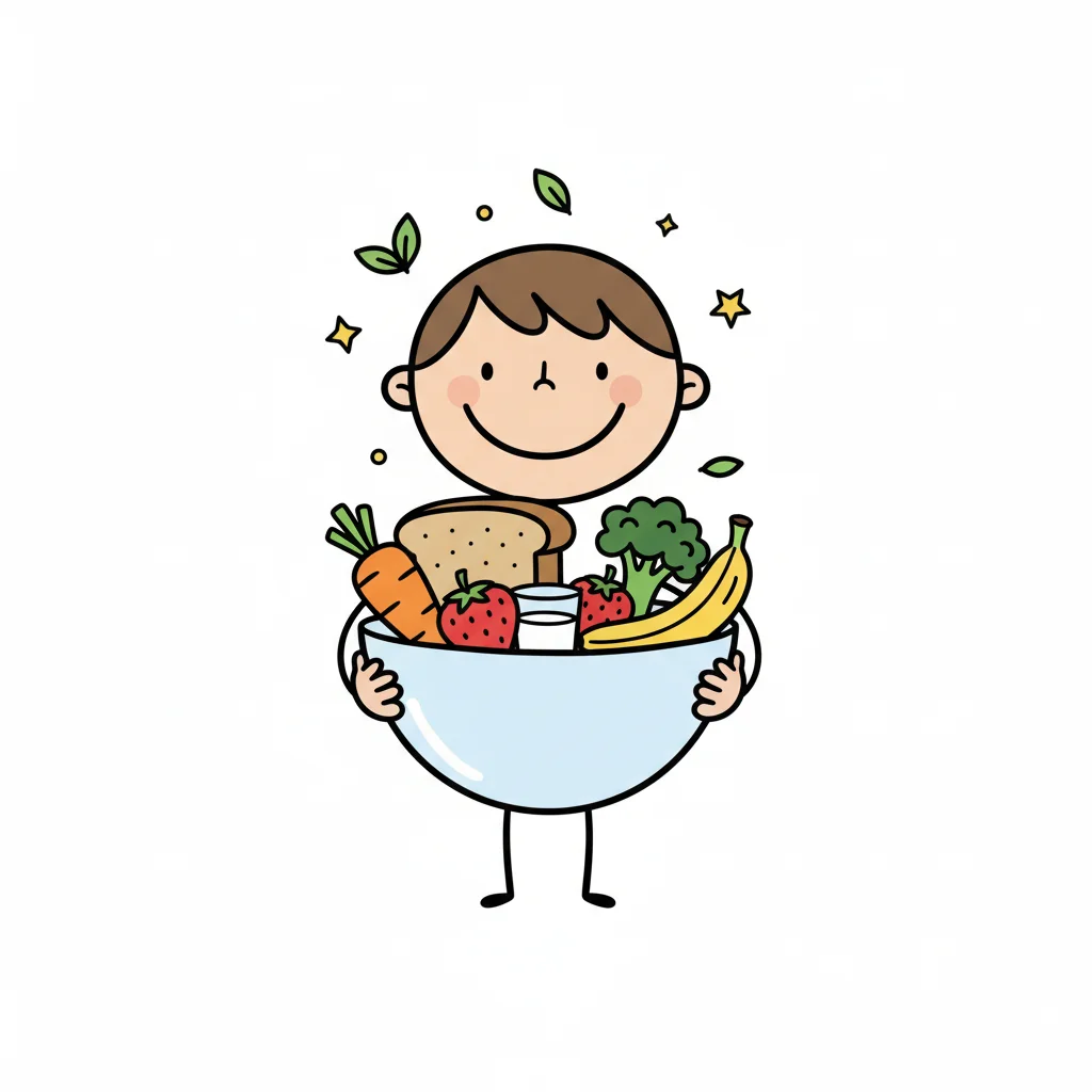 Glückliches Cartoon-Kind hält eine Schale voller gesunder Lebensmittel wie Obst, Gemüse und Brot.
