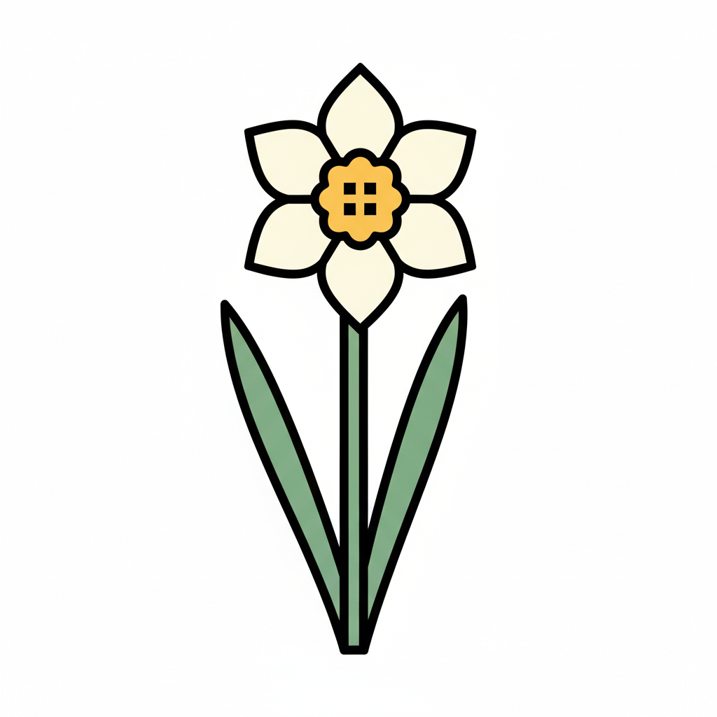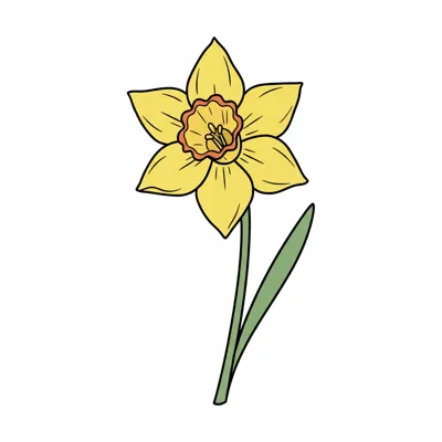 Gelbe Narzisse mit grünem Blatt, stilisiert und einfach gehalten.