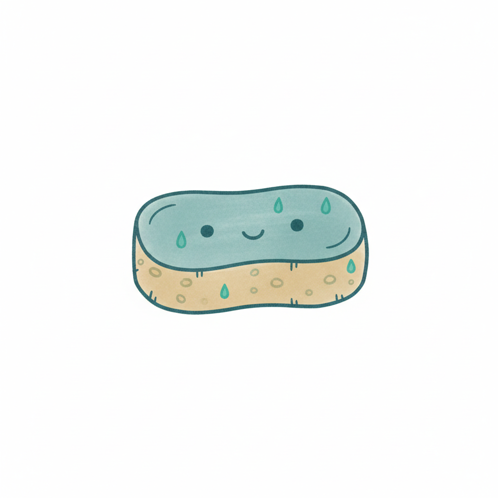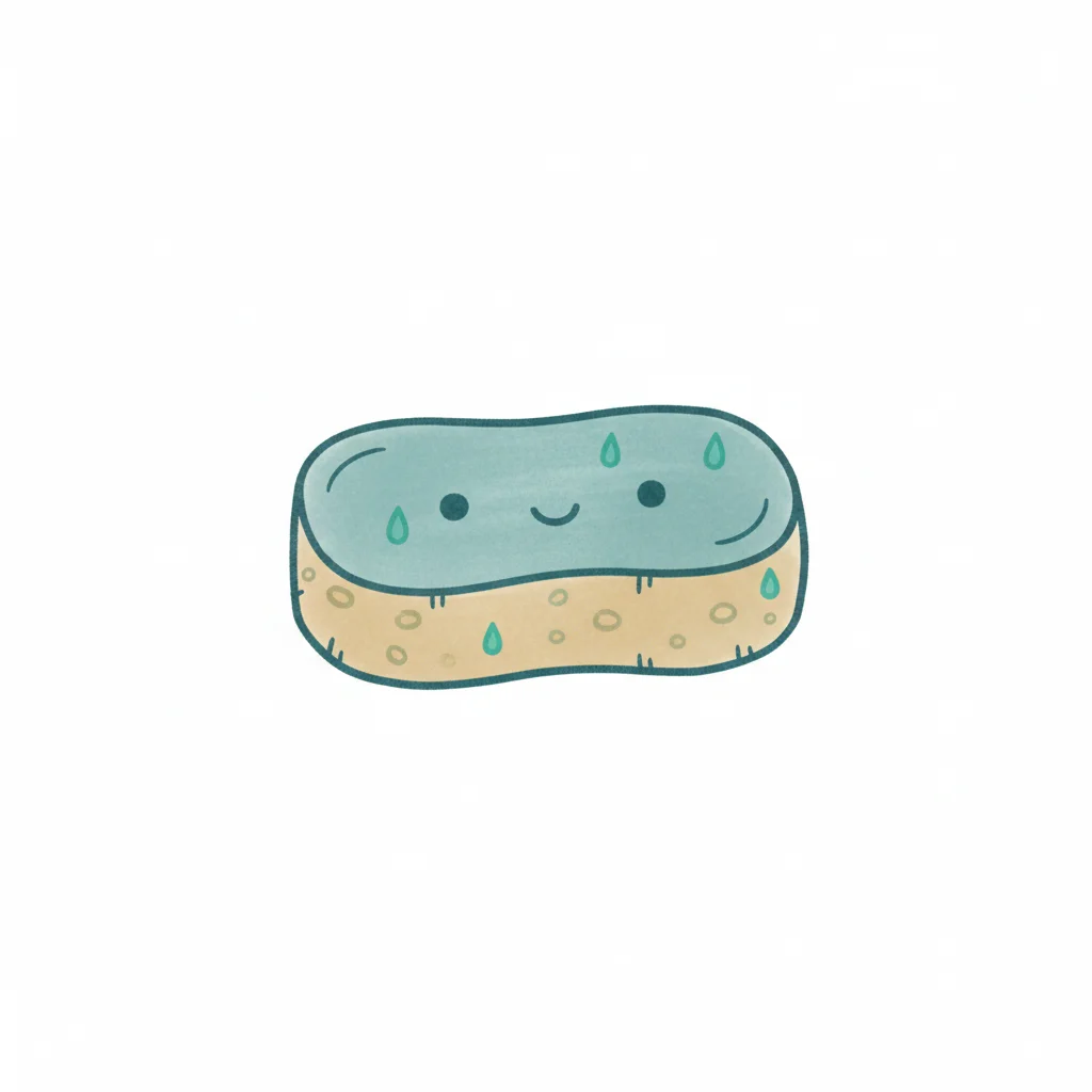 Ein süßer, nasser Schwamm mit einem lächelnden Gesicht und Wassertropfen auf weißem Hintergrund.