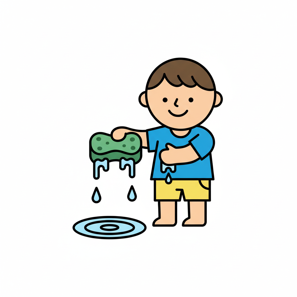 Ein lächelnder Cartoon-Junge drückt einen nassen Schwamm aus, Wasser tropft auf den Boden.