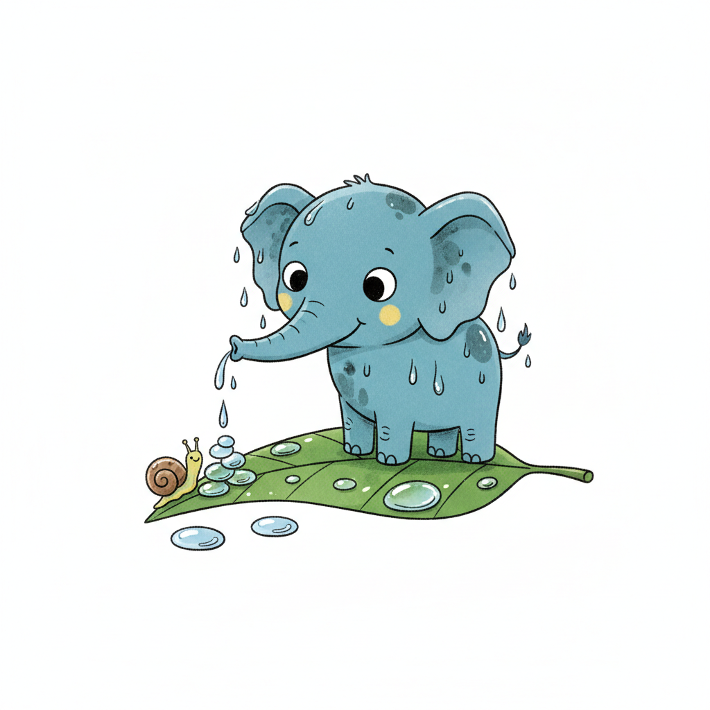 Nasser Baby-Elefant spritzt Wasser auf eine Schnecke auf einem Blatt. Süße Tierillustration.
